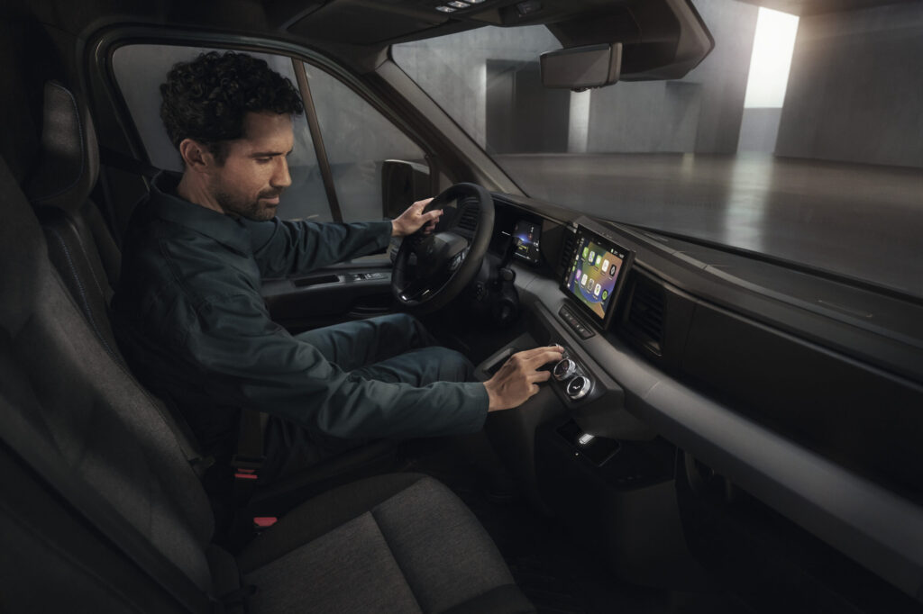 Le poste de conduite du nouveau Master se voit doté d’un tableau de bord orienté vers le conducteur comme ça se généralise chez les constructeurs. Cela rend les instruments plus lisibles, l’instrumentation digitale plus visuelle et pratique et les rangements plus nombreux permettent de disposer de 135 litres utiles en hausse de 25 % . C’est une belle évolution avec l’apparition du système multimédia OpenR Link avec un écran tactile de 10 pouces compatible Apple CarPlay ou Android de série. En option, il sera possible d’améliorer l’équipement avec l’ajout de Google intégré, offrant plus de 50 applications à partir de Google Play. Sans oublier le chargeur de smartphone sans fil. Il y a d’autres amélioration comme le volant réglable en hauteur et en profondeur. Renault a aussi retravaillé ses sièges, notamment au niveau de l’assise, afin qu’ils résistent mieux aux montées et descentes de la cabine.
